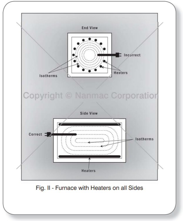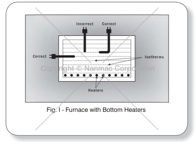 Fig. I is a schematic of a furnace with heating elements at the bottom. The isotherms are shown as dotted tines. Fig. 11 is a similar sketch showing the isotherms in a furnace with heaters on all sides. In both sketches the correct orientation of the temperature sensors has been illustrated. In all instances, the correct orientation requires that the thermocouple extend parallel to the isotherms for a length equal to 20 times the probe diameter. A 3/8” diameter thermocouple probe thus should be inserted for a length of 7-1/2” inches along the isotherm.