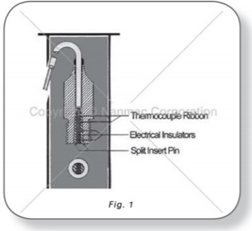 The special thermocouple used in these tests was designed and built by Nanmac Corporation. It is referred to as the “Self- Renewing“ or “Eroding“ Thermocouple. This design uses standard dissimilar thermocouple elements precisely the same as the conventional thermocouples mentioned above. However, in the vicinity of the “hot“ measuring junction, the sensing tip details are unique. The round wires of the dissimilar metals are ground and flattened into thin ribbons of about 0.0015/0.002 in thickness. These ribbon elements are electrically insulated from each other and the thermowell (thermocouple housing) by sheets of thin dielectric insulation of about 0.0002 inch thickness. This “sandwich“ of ribbon elements and thin dielectric insulation is then placed between a split-tapered insert and pressed into a mating tapered hole in the thermowell Fig. (1). The excess material is then machined off and the surface of the thermowell is polished with an abrasive cloth or sandpaper until smooth. The process of grinding and polishing the surface forms the “hot“ measuring junction automatically. The dielectric insulation between the two dissimilar ribbons is so thin that metallic whiskers of one ribbon (thermocouple) element bridge the dielectric and make hundreds of microscopic friction welded junctions which are parallel to one another thus forming one composite measuring junction, the junction is formed only on the surface of the housing, therefore exact location is known to the user. Any subsequent erosion of the surface (rocket blast, grinding, interface erosion) of the thermowell simply forms new junctions while removing the old junctions. Hence its name, “Self-Renewing (SR) Thermocouple.“ The sensing tip can be machined to match any contour. Additional information on the “Self-Renewing“ thermocouple is available.