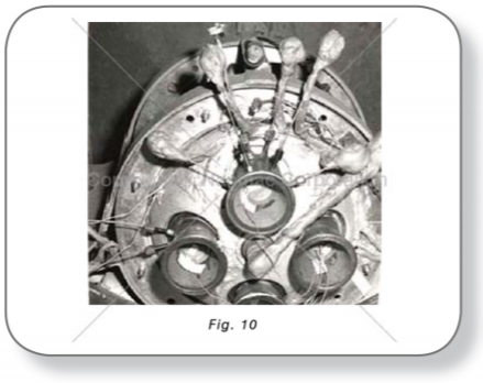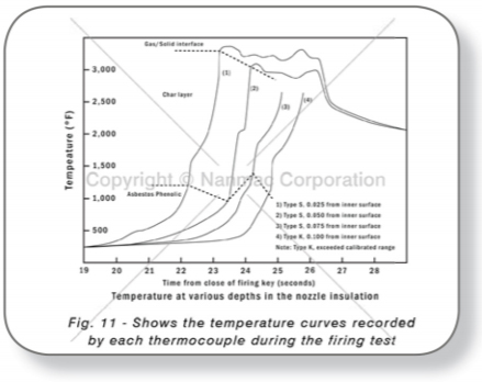 In another type of rocket motor Fig. (10) (Polaris Scale Model Fiberglass Motor), four “Self- Renewing“ thermocouples were installed in the asbestos-phenolic (RPD 150) insulation of the exit cone at depth of 0.025, 0.050, 0.075 and 0.100-inch from the inner surface. All thermocouples were located in the same longitudinal plane but again, displaced radially. Post-firing examination revealed that erosion had exposed the sensing surface of all four thermocouples. The thermocouple which was originally closest to the inner surface was shortened about 1/8 inch.