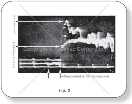 Fig. (2) is an actual oscilloscope screen shot of the pressure and temperature trace lines of the leading edge of shock wave. The SR Thermocouple and a high frequency pressure gage were located at the same longitudinal location in the shock tube. The shock tube was evacuated and filled with a combustible mixture and then electrically ignited at one end. The temperature and pressure were recorded as the detonation wave passed this location. The recorded temperature is the precise temperature seen by the inner wall surface as the wave passed by. A response time of eight (8) microseconds is recorded on this test. The actual measured temperature change is 225 degrees in eight (8) microseconds. This is equivalent to a rate of over 28,000,000 degrees Fahrenheit per second. The velocity of the detonation wave, in addition to its temperature data can thus be recorded by a series of thermocouples located longitudinally in the shock tube. The slight oscillations on the traces were caused by a combination of the mechanical vibration and the electromagnetic field associated with the detonation wave.
