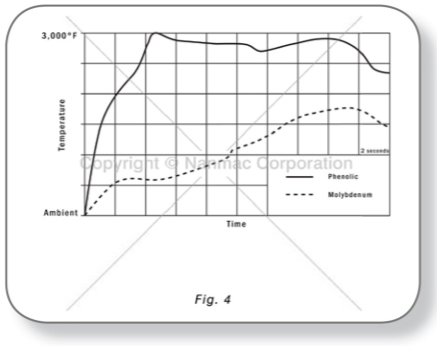 Typically, all contact temperature sensors (RTD’s, thermocouples, etc.) provide the user with data that exhibits the temperature of the sensor itself, as its environment affects it. Therefore, the thermal properties of the sensors must match those of the test wall otherwise, the temperature of the test wall is only assumed, rather than measured. By specific design, the SR thermocouple is made from the same material as the test wall i.e. graphite phenolic, EDPM rubber, etc. Hence, the temperature that is measured is ultimately that of the test wall material. Several tests have been conducted to demonstrate the effect using materials for the thermowell other then those of the test wall. Results of one such test conducted by the U.S. Navel Propellant Plant Fig. (4) demonstrates the large differences in the peak temperature measured at the surface of the wall, simply by changing the thermocouple housing material. The thermocouple geometry, location within the test chamber, thermocouple elements and the data acquisition are the same, the only difference between the two sensors is the thermocouple housing material.