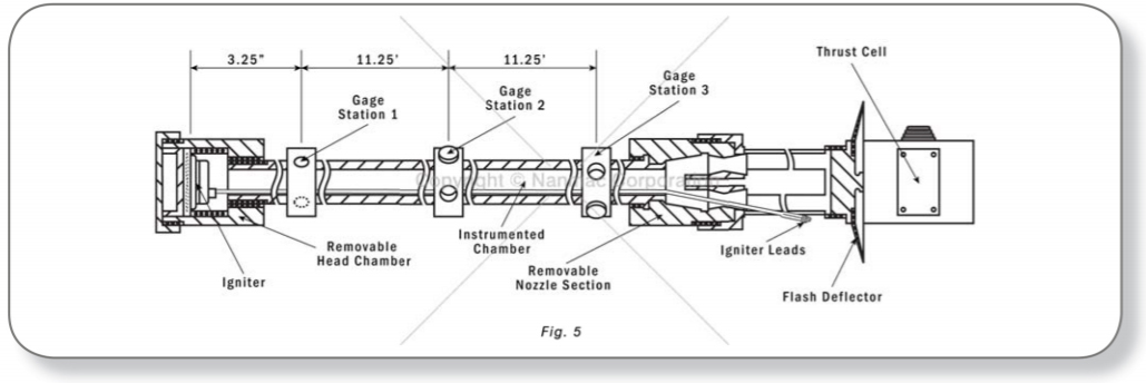 Our fighter pilots were complaining that their rockets would occasionally make 60° or 90° turns in front of the fighter planes. They were concerned that they would fly into their own rockets! Also, they complained that there were too many rockets that had intermittent ignition, delayed ignition, etc. Unless we could fix these problems, the NAW was going to scrap millions of these rockets. A simulated rocket was designed which had the same internal dimensions as the real rocket. This simulated rocket motor contained a removable igniter chamber and a removable nozzle section. The removable feature allowed us to condition these sections at various temperatures from —40° to + 140°F. The motor chamber contained three gage stations — each with a pressure gage and thermocouple inlets. Fig. (5) is a drawing of this simulated rocket chamber.