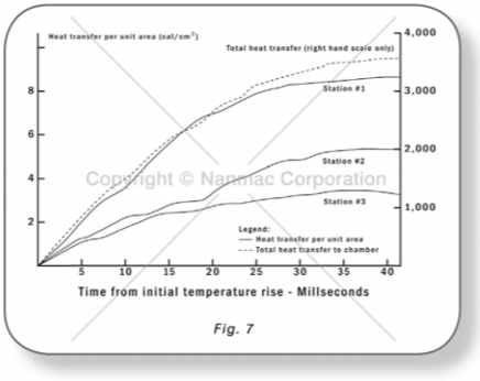 Test equipment and mathematical procedure used to calculate the rate and total heat-transfer data were evaluated by firing several randomly chosen igniters in the chamber after it had been assembled with closed end nozzle fixture. A comparison of the total heat thus measured with the mean standard heat-of- explosion values of similar igniters showed that there was no statistically significant difference between the data obtained by the two different methods. Once this had been established, the test chamber was fitted with standard nozzle assemblies, and additional data were obtained. In these tests, the igniters were subjected to the various nozzle closure effects normally experienced in actual use. The usual ballistic characteristics such as ignition delay, burning time, maximum pressure, and pressure-time integrals were determined from the pressure oscillograms. The rate of heat transfer and the total heat transfer from the igniter to the wall of the test chamber were calculated from the temperature oscillograms. Fig. (7) contains the average of several igniter-firing tests.