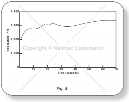 Rocket motors are usually tested in the tie-down fixtures inside a concrete firing bay. The thrust cells are usually attached at the front end of the motor. Several SR thermocouples were installed in a second nozzle half-ton charge motor to measure the inner surface temperatures at several locations during captive firing tests (Ref. (3). The calculated combustion temperatures of the propellant used in these tests is in excess of 6000°F. All thermocouples use W/W-26%Re-elements. Fig. (8) is a typical temperature trace of a “Self-Renewing“ thermocouple located 2-1/2 inches forward of the nozzle throat.