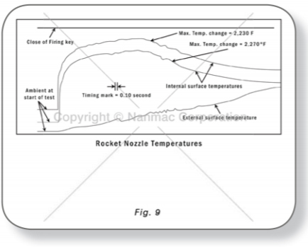 The nozzle of a Terrier Booster was drilled and tapped with appropriate holes to accommodate two thermocouples at the same longitudinal plane in the nozzle but displaced radially 180°. The thermocouples were located at the surface of the nozzle throat. When installed in the nozzle, the sensing tips of the thermocouples were aligned flush with the inner wall of the nozzle so that the gas flow was not disturbed in any way. Extreme caution was exercised in aligning the thermocouples such that they were flush with the wall as any protrusion or recess of the thermal junction with respect to the wall will cause erroneous temperature measurements. In addition to the two thermocouples at the inner surface of the nozzle throat, a common welded thermocouple was attached to the exterior surface at the same location to measure the external temperature A reproduction of the actual test oscillogram of one such firing test is shown in Fig. (9). The maximum temperature changes recorded by the two nozzle-throat thermocouples were 2230°F respectively.