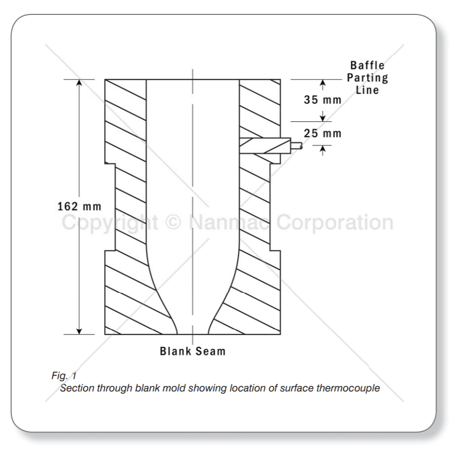 Mr. Roger Kent of the British Glass Industry Research Association (Ref. b ) has designed a uni-dimensional heat flow system subjected to a transient heat input into one face. This requires that the temperature time variations at two suitable points in the mold be measured. It was accomplished by installing two thermocouples in the mold wait. A Nanmac surface thermocouple was used to measure the variation of the mold surface temperature continuously. The thermocouple body is of the same material as the mold and the sensing surface was mounted normal to the glass contact interface. This thermocouple has to meet two main requirements. It has to have a high speed of response so that it accurately follows the transient temperature changes occurring at the mold surface. Also, it must simulate the wall surface with minimum distortion of the existing heat flow pattern in the mold. In laboratory tests conducted by Mr. Kent, the Nanmac surface thermocouple met both of these requirements very faithfully.