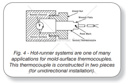 Since the sensing tip of surface thermocouples can be machined to match any surface contour, these thermocouples can even be installed in hot-runner systems. Figure 4 shows a typical installation. Either the surface or adiabatic-type probe can be used.