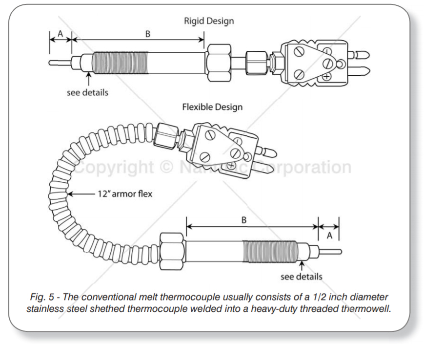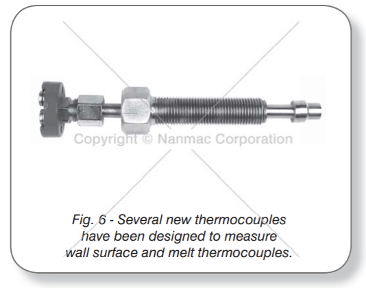 New melt thermocouple designs are several thermocouples, designed to measure the wall surface temperature and melt temperature are shown in Fig. 6. If the wall surface temperature is to be measured, the thermal junctions are the electrically grounded type, similar to the thermocouple described above for measuring part temperature. The tip of the sensor should protrude about 0.04 - 0.05 in. into the melt stream, because, in addition to boundary layer effects, in some instances the plastic flowing in the nozzle momentarily sticks to the inside surface, acting as an insulator. When this happens, the thermocouple does not sense the true melt temperature.