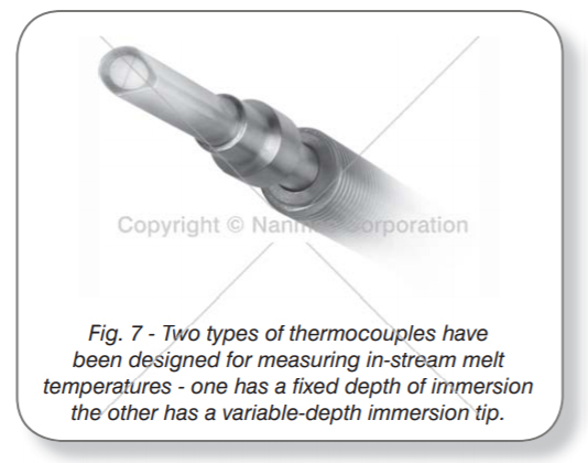 There are two inherent limitations in the design of the conventional melt thermocouple, namely slow response time and conduction errors. The response time of the sheathed thermocouple is too slow to measure rapidly changing temperatures in cyclical applications such as injection molding. Since all of these thermocouples are installed perpendicular to the plane of heat flow, large conduction errors exist whenever there is a temperature gradient. The thermocouple senses a temperature that is very closely related to that of the large heat sink—the barrel wall—rather than the true melt temperature.