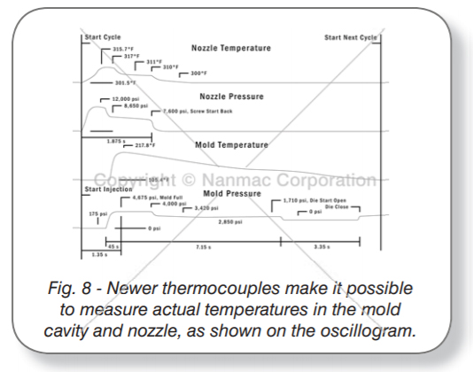 With more accurate, faster responding temperature sensors, such as those described above, it is now possible to measure actual temperatures in the mold cavity or extruder, rather than just the peak or average temperature. Fig. 8 is a reproduction of an actual test oscillogram showing both temperature and pressure vs. time data in both the nozzle and the injection mold cavity during a single injection cycle. Note the correlation between the response times and the important events occurring in a typical injection cycle. The temperatures were recorded using ribbon-type thermocouples similar to those shown in Fig. 6.