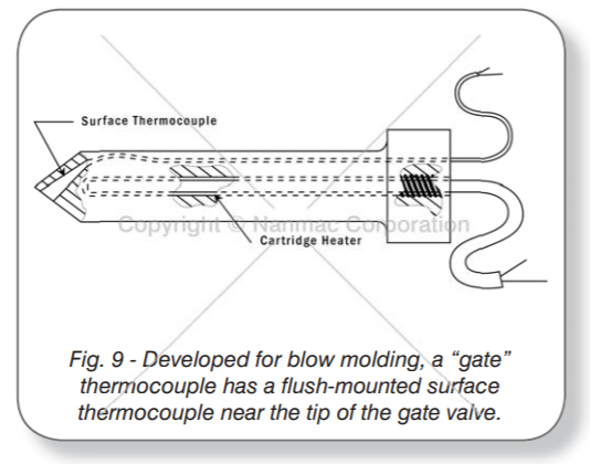 Occasionally, there is a requirement in blow molding to measure the surface temperature of the gate valve, in order to control its temperature more accurately. This can be accomplished by installing a surface thermocouple with a tapered thermowell into the gate valve. The thermocouple is press-fitted into a mating tapered hole in the gate, and any excess material that may be protruding is ground off. The completely installed unit has a flush-mounted surface thermocouple near the tip of the gate